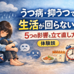 #082.うつ病・抑うつ状態で生活が回らない…?5つの影響と立て直し方【体験談】 Posted by By kajukazu.5k@gmail.com 2026-01-12 メタディスクリプション うつ病・抑うつ状態になると、興味の消…
