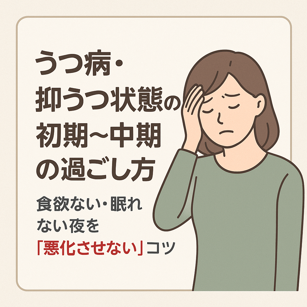 うつ病・抑うつ状態の初期〜中期は、気合いで立て直そうとするほど空回りしやすい時期です。この記事は「初期=安全確保と水分(食欲がなくてもOK)」「中期=5分だけ動く→休む」を軸に、何もできない・寝たきり、眠れない夜、不安で動けない、人の目がつらい日の過ごし方を短く整理。INDEX直後に1分セルフ判定、心療内科の通院が不安な人向けに予約とメモのコツも掲載。受診の赤旗はYES/NOで確認し、相談先は選び方→番号→公式リンクで案内します。拾い読みでOK。